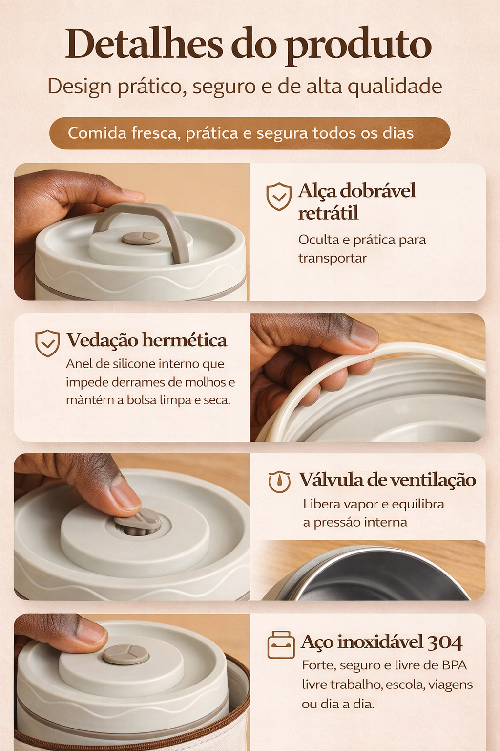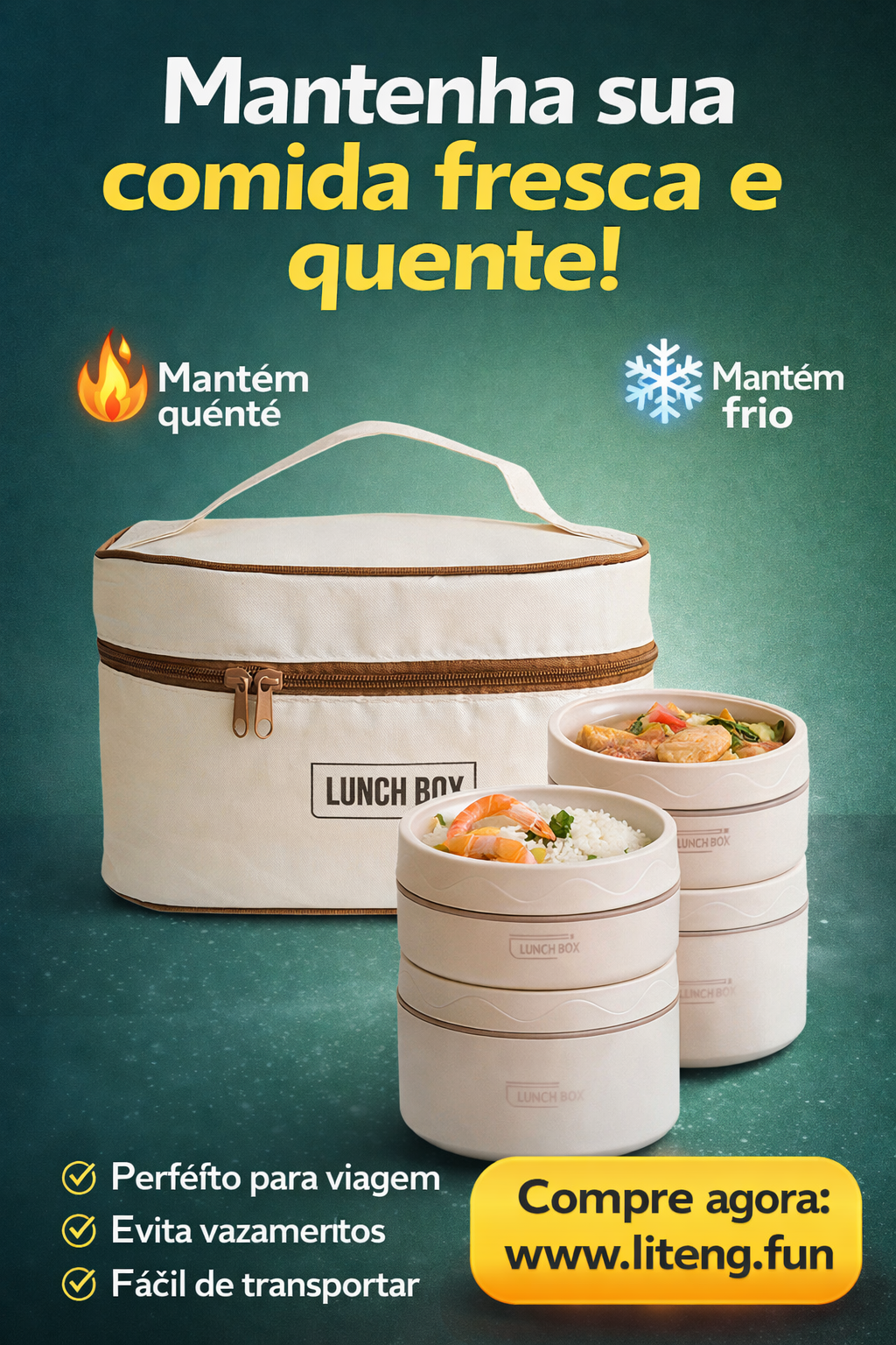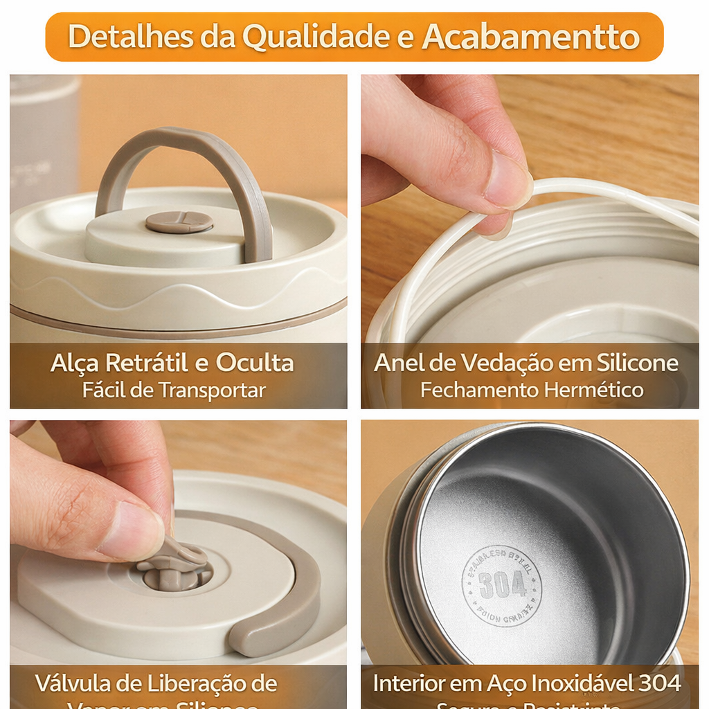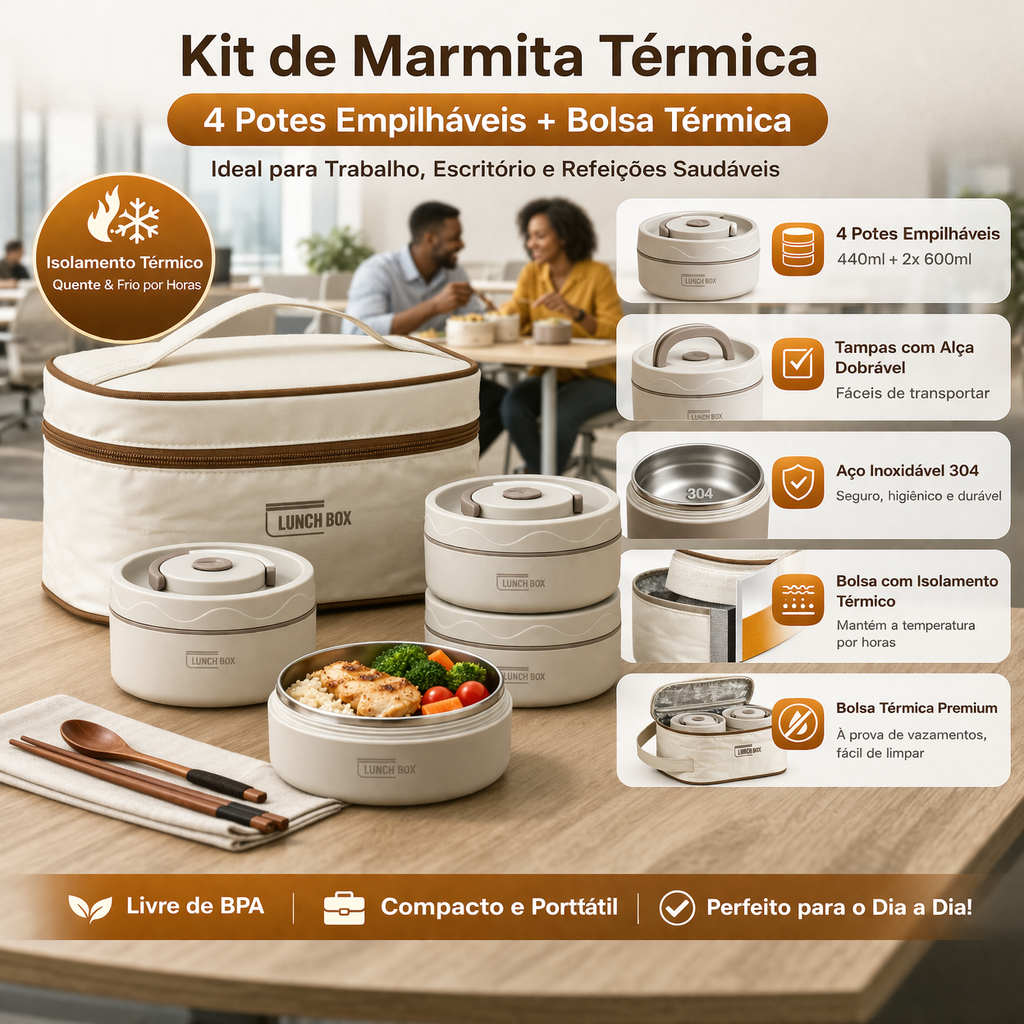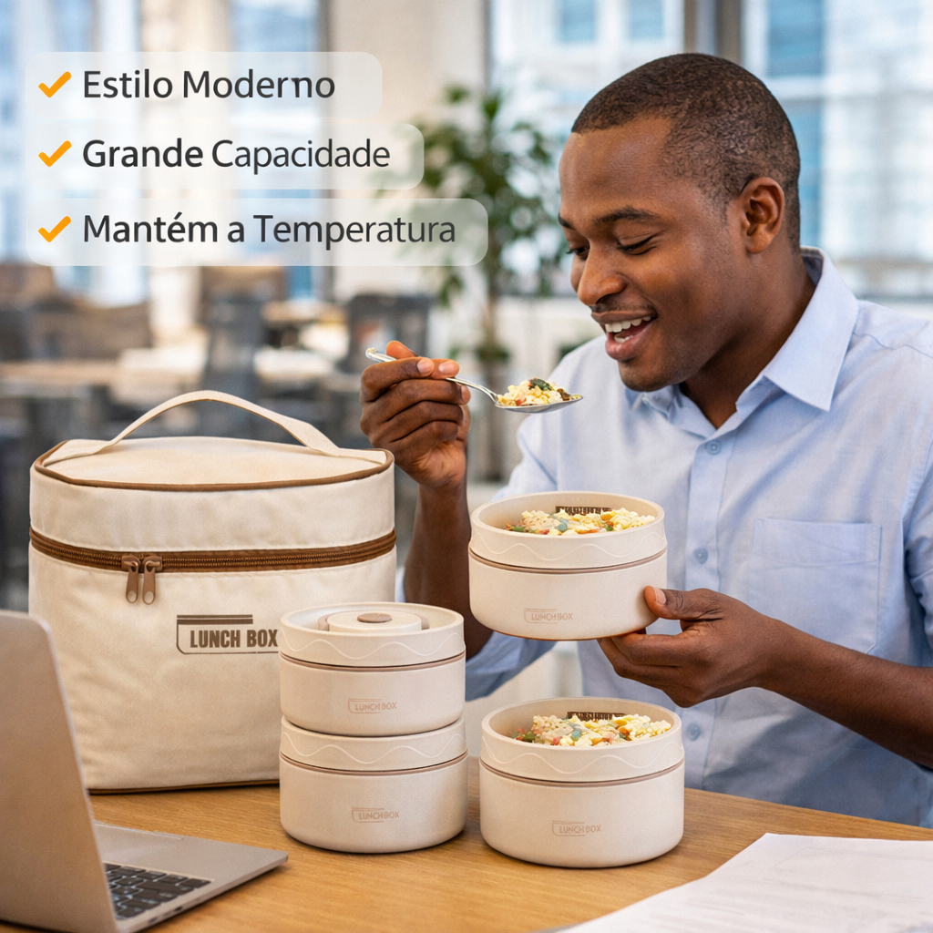 - 💼 No trabalho: Leve almoços caseiros saudáveis, evite gastos com delivery e mantenha sua comida na temperatura ideal até a hora da refeição.