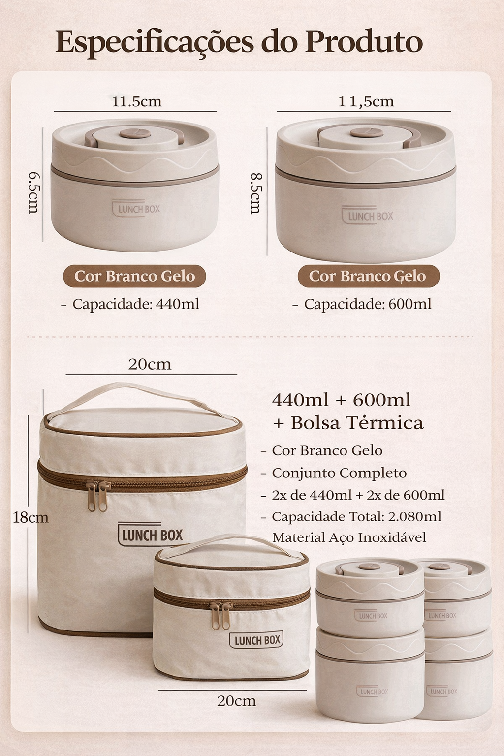 Com design moderno na cor branco gelo, o kit combina tecnologia de isolamento térmico, materiais premium e uma bolsa isotérmica inclusa, para manter sua comida quente ou fria por horas, sem vazamentos, sem mistura de sabores e sem complicações. Seja para o trabalho, escola, viagens ou passeios em família, essa lunch box transforma a forma de levar suas refeições!