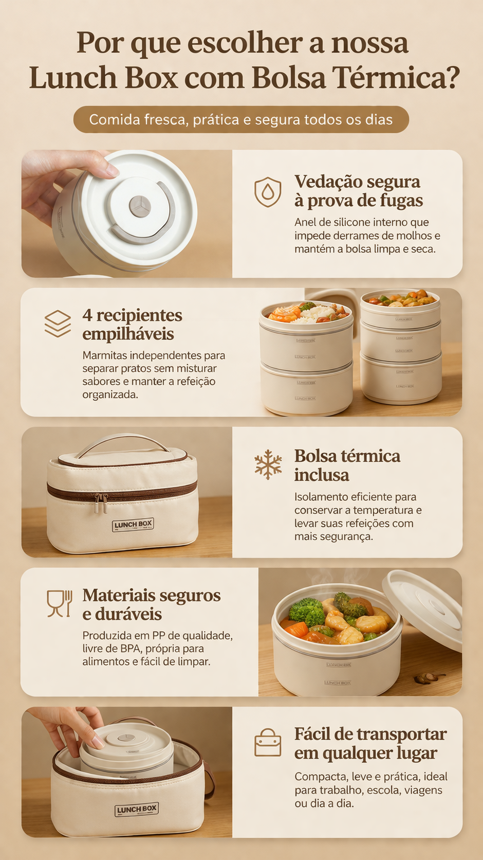 - 🎒 Na escola: Ideal para crianças e adolescentes, com marmitas seguras, fáce de abrir e que mantêm a comida fresca durante todo o período escolar.