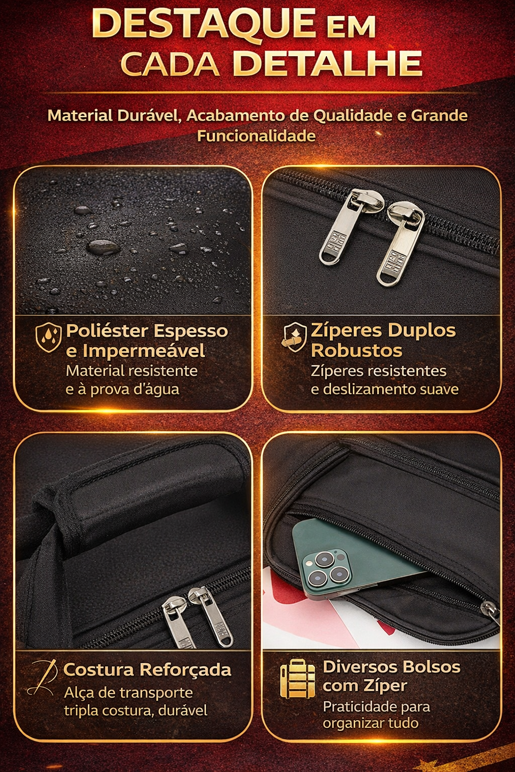 ✅ +11 COMPARTIMENTOS 📦: Organize todos os seus itens com facilidade, nada de bagunça!✅ CAPACIDADE AMPLIÁVEL 📈: Aumente o espaço quando precisar levar mais coisas!✅ IMPERMEÁVEL E DURÁVEL 💧: Feita de poliéster grosso resistente, protege suas coisas da chuva!✅ ZÍPERES DUPLOS ROBUSTOS 🔒: Deslizamento suave, não quebra fácil, durabilidade garantida!✅ COSTURA REFORÇADA 💪: Alças de transporte triplas costuradas, aguenta peso sem problema!